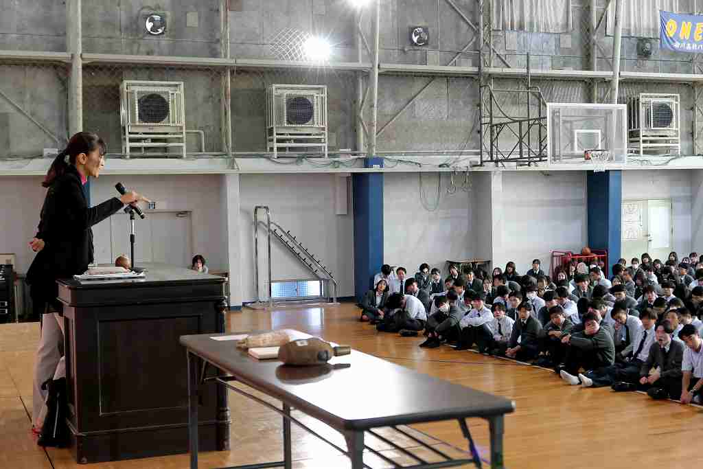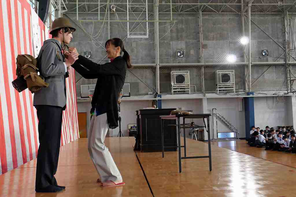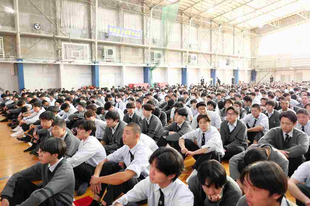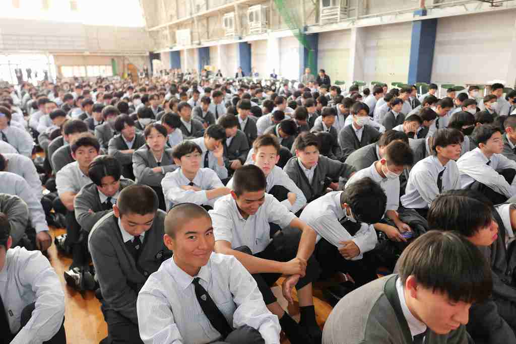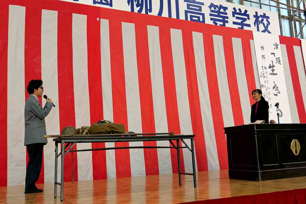 10月29日(水)、北九州平和資料室 TICO PLACE管理人の小松芳子さんが来校され、人権・同和教育講演会がありました。今年で戦後80年経ち、次第に戦争の実体験をした人が身近からいなくなっている現在、過酷で悲惨な経験をした戦争体験者や家族から戦争体験を聞かれてきた戦争の実情がわかる貴重なお話や映像、預かっておられる戦時遺品など持参され、生徒たちに戦争の悲惨さと平和の大切を語っていただきました。また、兵隊さんが行軍中担いでいた「背嚢(はいのう)」と木銃を、代表生徒がステージ上で担いで歩き回る体験をしました。今回担いだものは15kgでしたが実際の兵隊が担いだ背嚢は25~35kgあり、一日あたり20~25kmも行軍したと聞いてその過酷さがよく分かった体験だったようです。今回の講演会を通じて、生徒たちの心に大いに響くものがあったと思います。有難うございました。