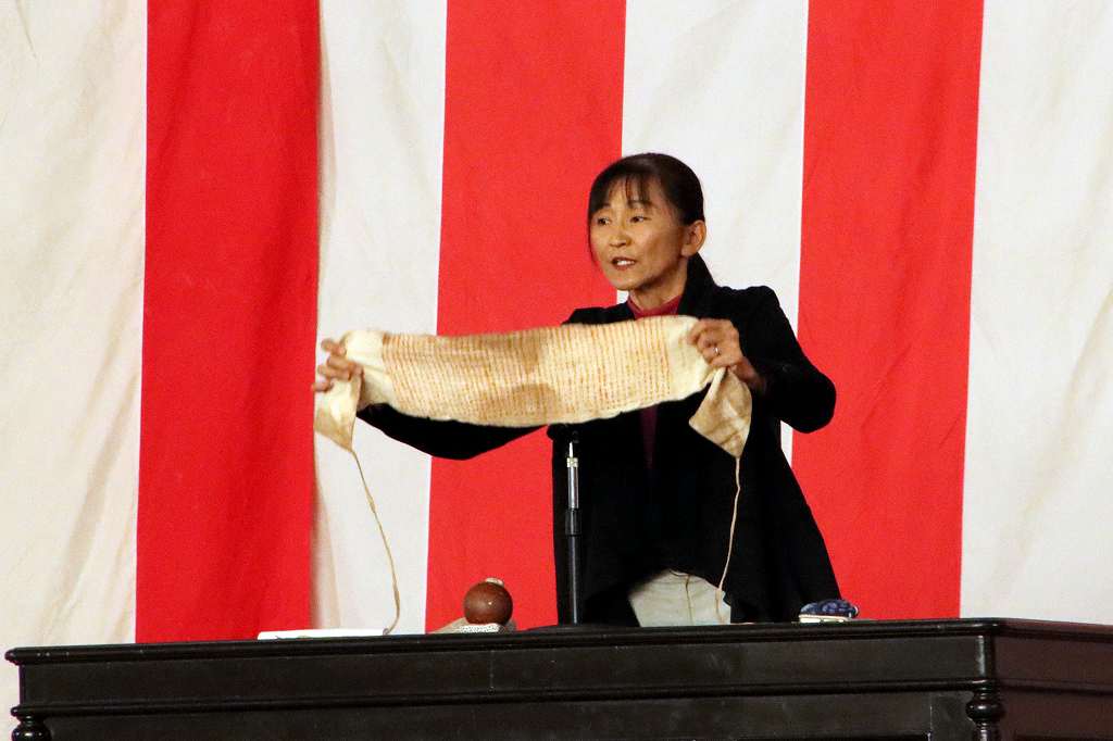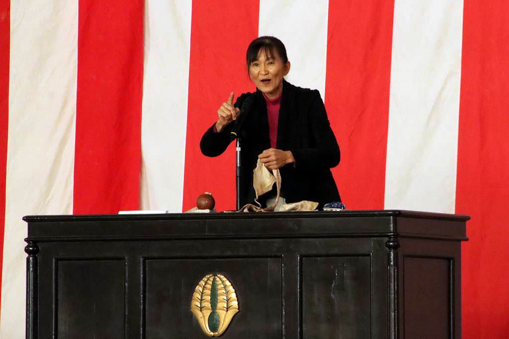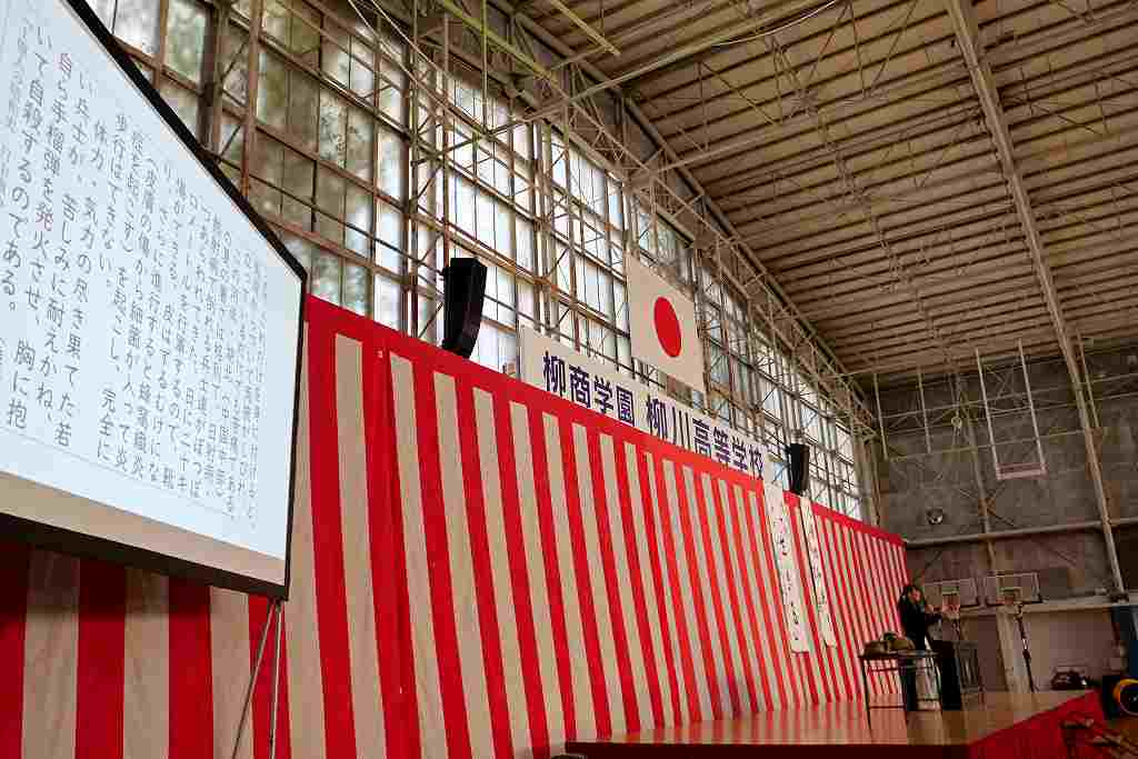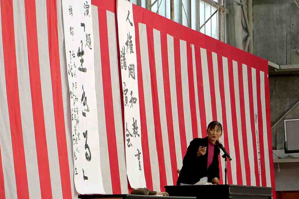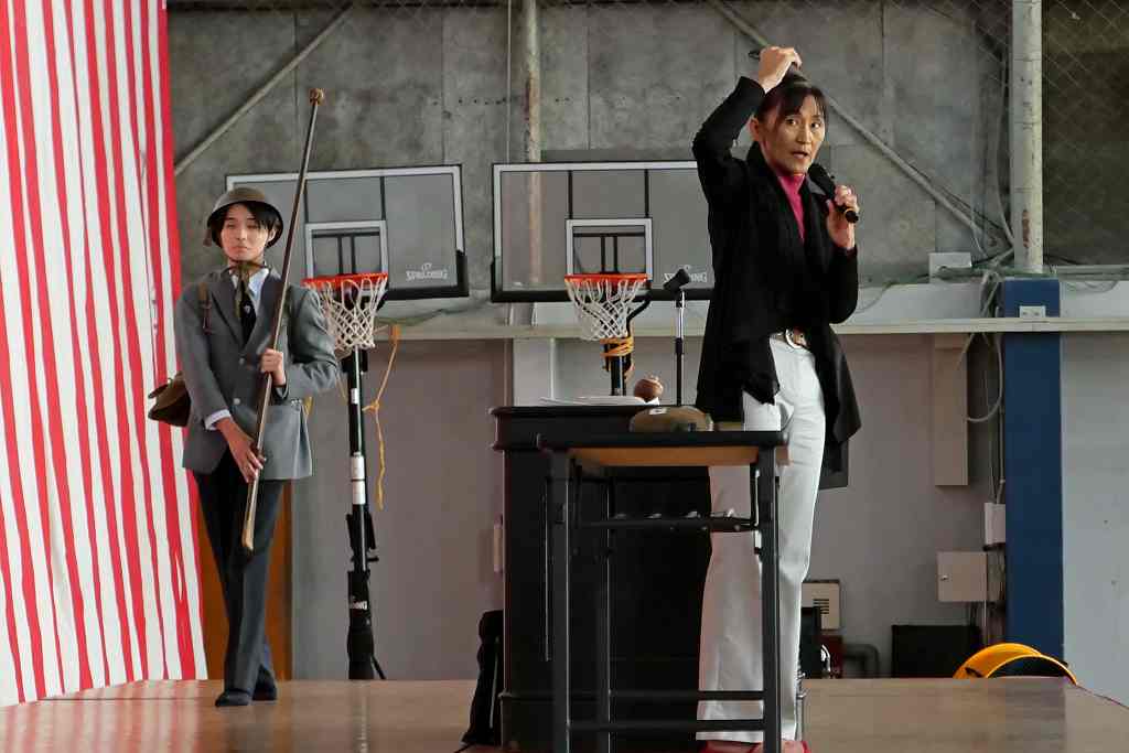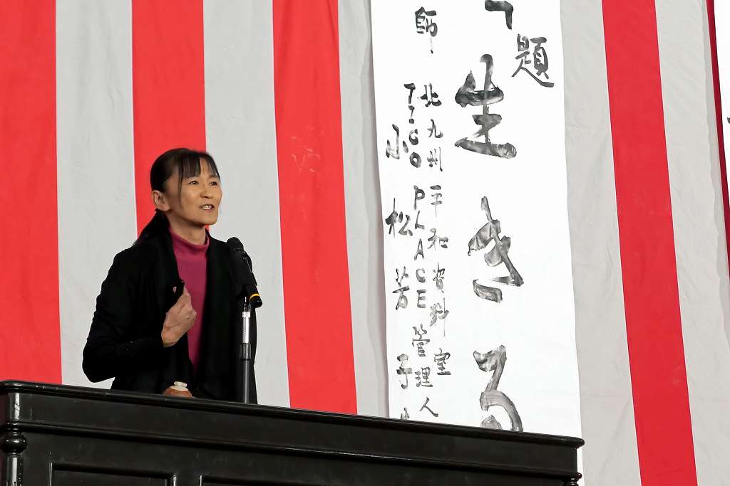 10月29日(水)、北九州平和資料室 TICO PLACE管理人の小松芳子さんが来校され、人権・同和教育講演会がありました。今年で戦後80年経ち、次第に戦争の実体験をした人が身近からいなくなっている現在、過酷で悲惨な経験をした戦争体験者や家族から戦争体験を聞かれてきた戦争の実情がわかる貴重なお話や映像、預かっておられる戦時遺品など持参され、生徒たちに戦争の悲惨さと平和の大切を語っていただきました。また、兵隊さんが行軍中担いでいた「背嚢(はいのう)」と木銃を、代表生徒がステージ上で担いで歩き回る体験をしました。今回担いだものは15kgでしたが実際の兵隊が担いだ背嚢は25~35kgあり、一日あたり20~25kmも行軍したと聞いてその過酷さがよく分かった体験だったようです。今回の講演会を通じて、生徒たちの心に大いに響くものがあったと思います。有難うございました。