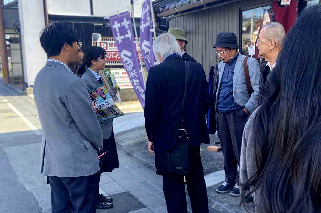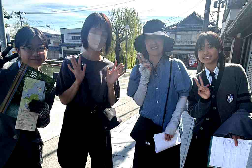 10月30日(木)、国際科に在籍中の留学生で日本語検定1級(N1)クラスの生徒5人が、柳川の沖ノ端地区を訪れた観光客に対して、校外学習の一環で日本語と使って質問コミュニケーションを図りながら、柳川のお勧め観光スポットを伝える体験をしました。留学生たちは初めての体験に、声掛けするのに戸惑ったり、用意した質問が緊張のせいで半分しか聞けなかったりしましたが、生徒たちの真剣な姿に観光客の方々もきちんと対応して下さり、生徒たちの日本語の上手さに驚かれていました。机上の日本語ではなく生きた日本語を使った体験で、生徒たちにとっては自信がついたようでした。